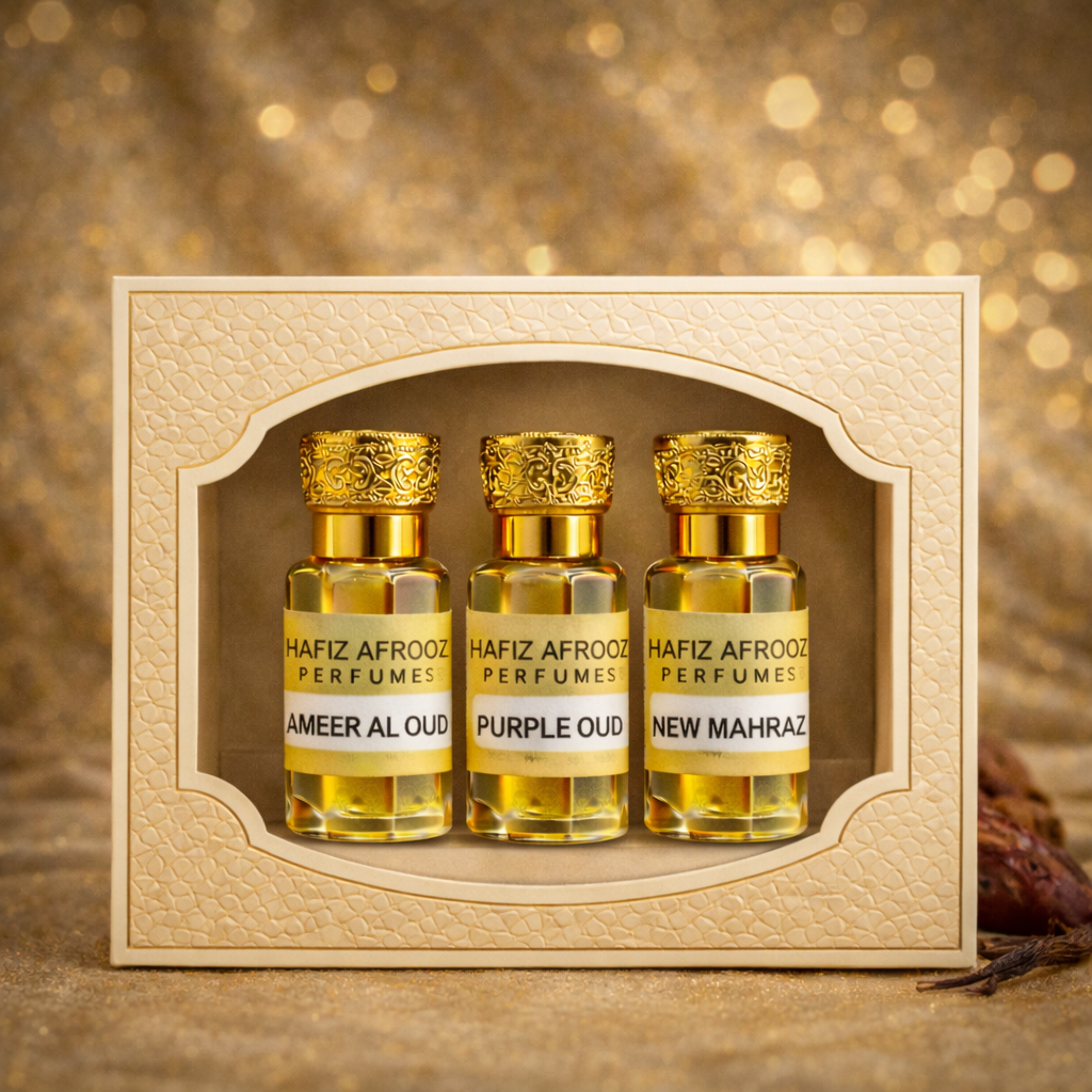 This Ramadan, indulge in our exclusive 3-attar combo featuring Ameer Al Oud, Purple Oud, and New Mahraz — premium alcohol-free scents with deep oriental character and all-day freshness.